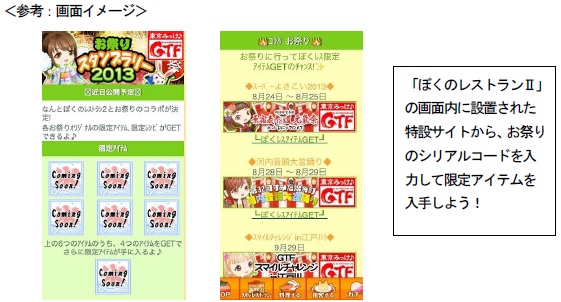 株式会社enish(本社:東京都渋谷区、代表取締役社長:杉山 全功、以下「エニッシュ」)が提供するソーシャルゲーム『ぼくのレストランⅡ』は、ヒーローズエデュテイメント株式会社(本社:東京都千代田区、代表取締役会長兼社長:秋沢 志篤)が「お祭りやイベントで東京圏を活性化することを目的に」主催するGTFグレーター トウキョウ フェスティバル(以下「GTF」)とコラボし、東京圏内で実施される4つのお祭りと連動したO2O(※)キャンペーンを実施します。