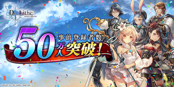 株式会社enish(本社:東京都港区、代表取締役社長:安徳 孝平、以下enish)は、2020年1月22日(水)配信予定のドラマチック共闘オンラインRPG『De:Lithe(ディライズ) ~忘却の真王と盟約の天使~』の事前登録者数が50万人を突破したことをお知らせいたします。これにより、これまでに配布が決まっていたアイテム群に加え、希少な素材詰め合わせの無料配布が確定いたしました。
