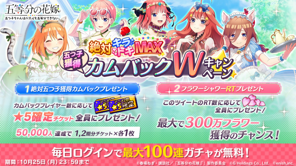 株式会社enish(本社:東京都港区、代表取締役社長:安徳 孝平、以下enish)は、アニメ「五等分の花嫁」初となるゲームアプリ『五等分の花嫁 五つ子ちゃんはパズルを五等分できない。』において、本日9月22日(水)より、絶対キラドキMAX五つ子獲得カムバックキャンペーンを開催いたします。
