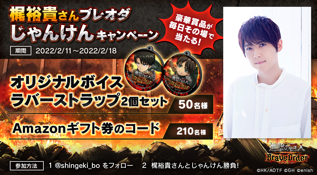 株式会社enish(本社:東京都港区、代表取締役社長:安徳 孝平、以下enish)は、アニメ『進撃の巨人』のスマートフォンゲーム最新作「進撃の巨人Brave Order」本日2022年2月11日に配信を開始いたしましたのでお知らせいたします。こちらを記念いたしましてゲームアプリ公式Twitterアカウントにてキャンペーンを開催いたします。また、毎日その場で豪華賞品が当たるブレオダじゃんけんキャンペーンを開催いたします。最新情報は、ゲーム公式サイト・ゲーム公式Twitterアカウントにて随時公開して行きますので、ぜひご覧ください。