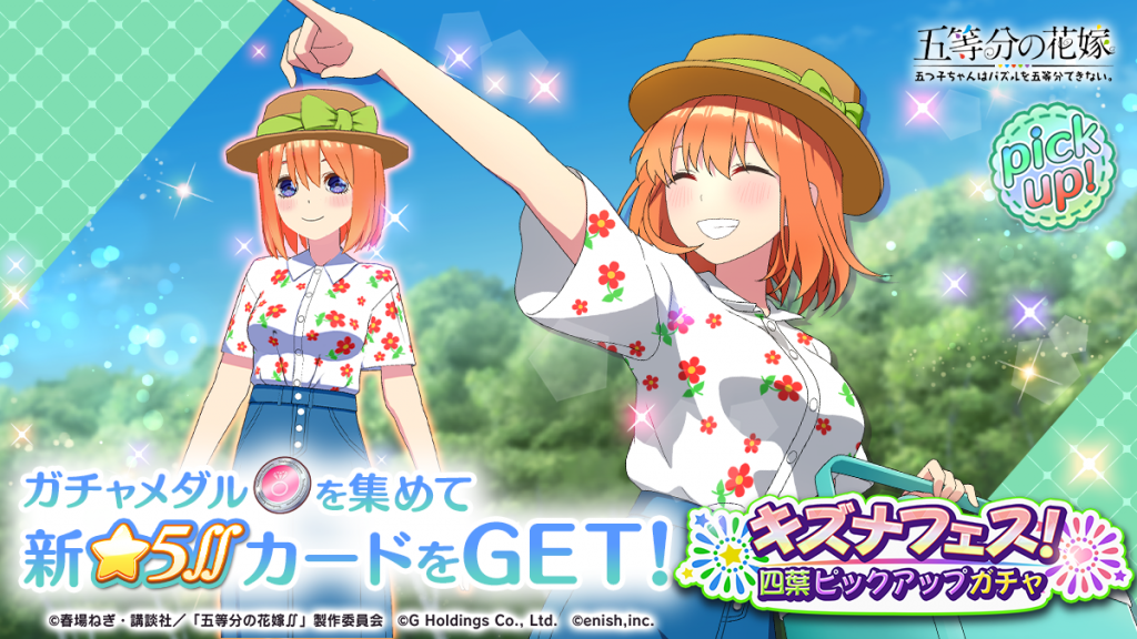 株式会社enish(本社:東京都港区、代表取締役社長:安徳 孝平、以下enish)は、2023年8月16日(水)より、アニメ「五等分の花嫁」初となるゲームアプリ『五等分の花嫁 五つ子ちゃんはパズルを五等分できない。』にて、「ごとぱずキズナフェス!・四葉とともに」を開催いたします。