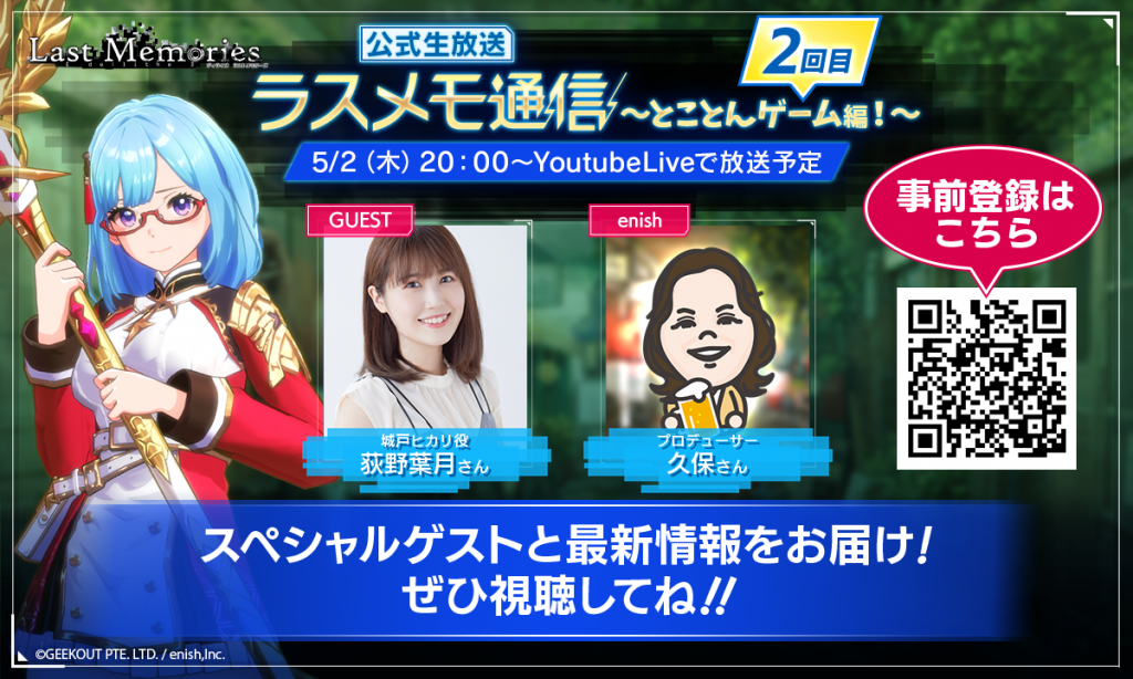 enish、モバイルゲームクオリティのブロックチェーンゲーム 『De:Lithe Last Memories』、 定期公式生放送「ラスメモ通信 ~番外編~」を 2024年5月2日(木)、3日(金)に配信! 〜Amazonギフトカードがもらえる記念キャンペーン開催中〜