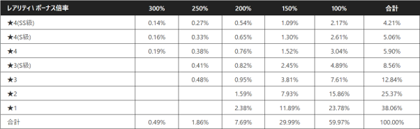 レアリティ別、earnボーナス倍率別の排出確率は下記の通りとなります。