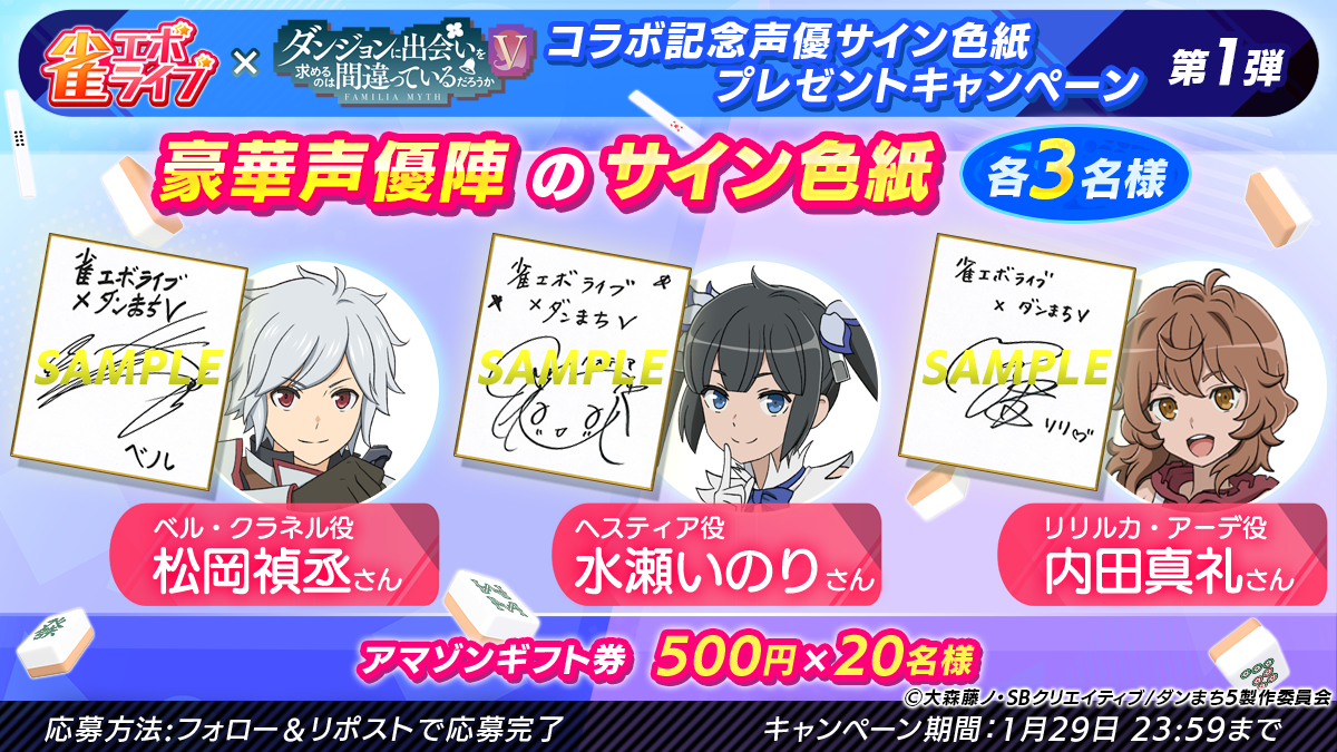 enishの新作麻雀ゲーム『雀エボライブ』、 アニメ「ダンジョンに出会いを求めるのは間違っているだろうかⅤ」とのコラボが決定! 〜コラボを記念した豪華声優サイン色紙プレゼントキャンペーンも実施!~