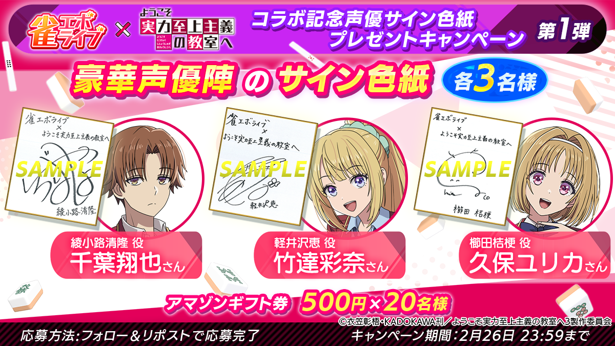 TVアニメ「ようこそ実力至上主義の教室へ」のキャラクターを演じる、千葉翔也さん、竹達彩奈さん、久保ユリカさんの直筆サインがそれぞれ3名様に、Amazonギフト券が20名様に当たるキャンペーンを開催中です。