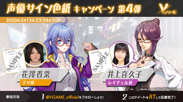 株式会社enish(本社:東京都港区、代表取締役社長:安徳 孝平、以下enish)は、2020年2月7日(金)、スマートフォン向け未来型アクションRPG『VGAME』にて、プレイアブルキャラクターに新キャラクター:アンタリン・デシ(CV.花澤香菜)を追加したことをお知らせします。それを記念して公式Twitterにて、花澤香菜さん(デシ役)、井上喜久子さん(レイチェル役)のサイン色紙プレゼントキャンペーンも開始しました。